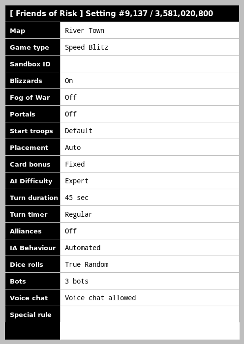 | Relaxed | EL-693 | Setting 8784 Arrakeen Residence Zombie Apocalypse True Random | nise [+0.24] 1276.68 Ingust [-0.07] 988.8 Serenity [-0.07] 993.66 eirik [-0.1] 1044.23 | nise |